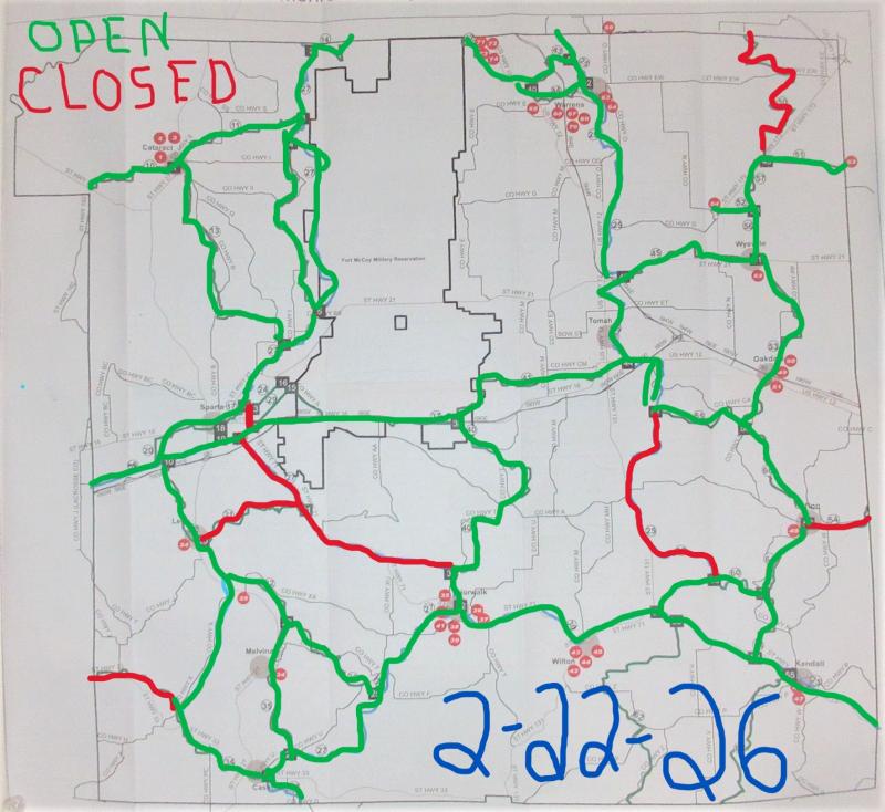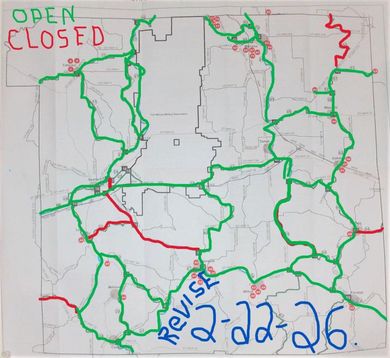 ALL TRAILS IN MONROE COUNTY ARE OPEN EXCEPT FOR THE FOLLOWING: THE ELROY-SPARTA BIKE TRAIL FROM SPARTA TO INTERSECTION 31 NORTH OF NORWALK DUE TO BRIDGES OUT DURING REPLACEMENT. TRAIL 31 FROM THE ELROY-SPARTA TRAIL INTERSECTION 21 TO LEON. TRAIL 34 FROM THE MELVINA TURN OFF TO THE LACROSSE COUNTY LINE AT MIDDLE RIDGE. TRAIL 54 FROM CLIFTON TO JUNEAU COUNTY, AND TRAIL 25 FROM INTERSECTION 35 TO 57 DUE TO LOGGING. TRAIL 50 FROM INTERSECTION 45 TO JACKSON COUNTY NORTH OF WYEVILLE ALSO CLOSED. WE HAVE OPENED THE LACROSSE RIVER TRAIL 30 FROM SPARTA TO LACROSSE.