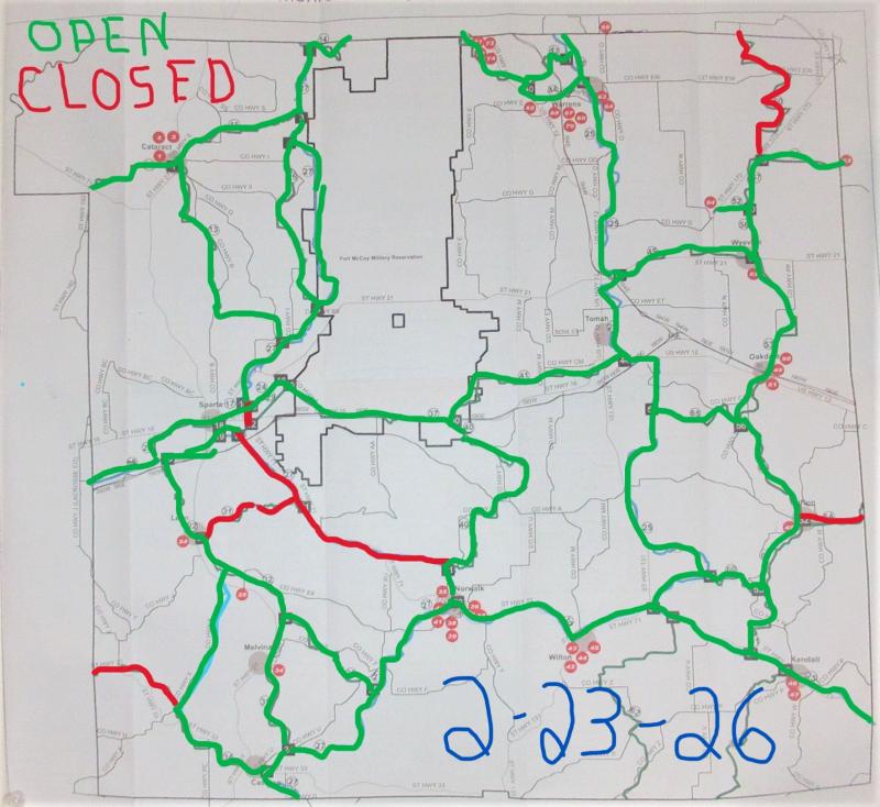 ALL TRAILS IN MONROE COUNTY ARE OPEN EXCEPT FOR THE FOLLOWING: THE ELROY-SPARTA BIKE TRAIL FROM SPARTA TO INTERSECTION 31 NORTH OF NORWALK. TRAIL 31 FROM THE ELROY-SPARTA TRAIL TO LEON. TRAIL 34 FROM THE MELVINA TURN OFF NEAR MIDDLE RIDGE TO THE LACROSSE COUNTY LINE. TRAIL 54 FROM CLIFTON TO JUNEAU COUNTY, AND TRAIL 50 FROM INTERSECTION 45 TO JACKSON COUNTY NORTH OF WYEVILLE ALSO CLOSED.