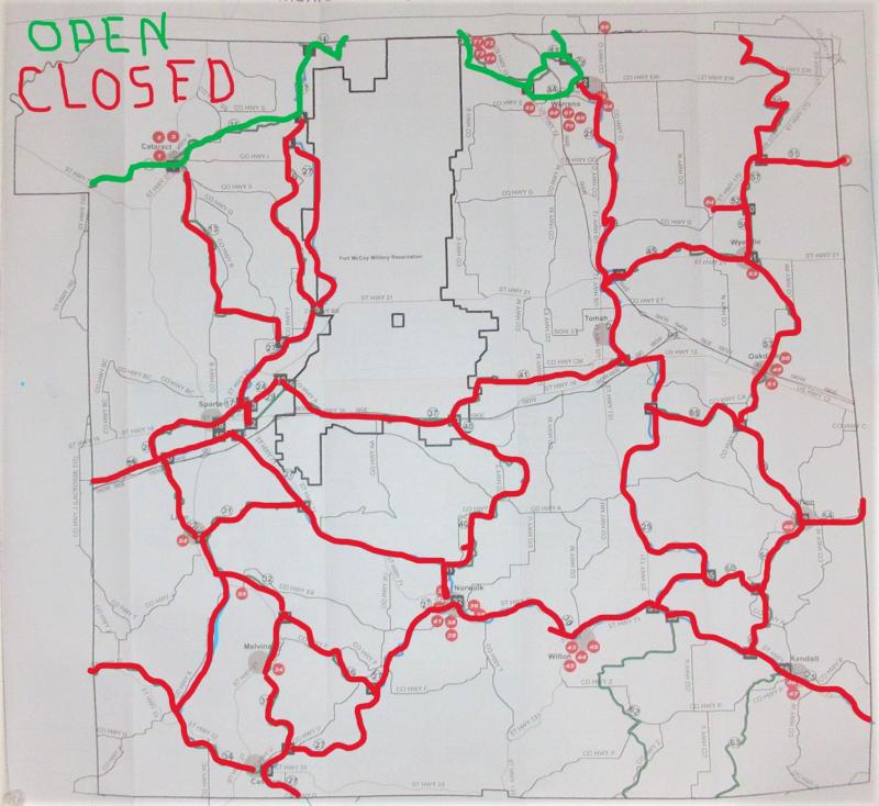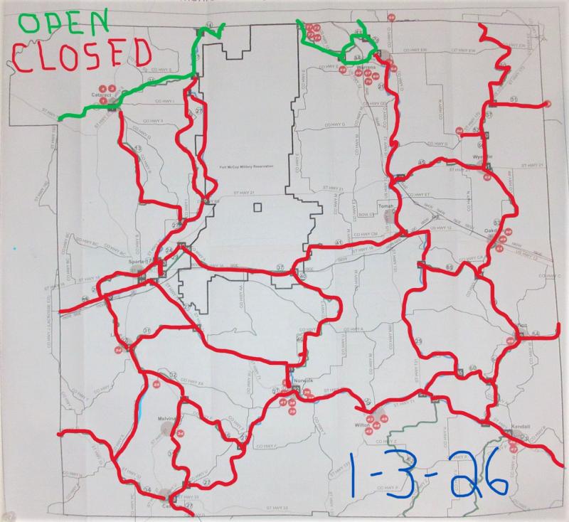 TRAILS 42, 43, 44 AND PART OF CORRIDOR 25 ARE OPEN NORTH OF COUNTY HIGHWAY EW BY WARRENS TO THE JACKSON COUNTY LINE HEADING TOWARDS MILLSTON AND JUNCTION CITY ONLY. CONDITIONS SHOULD BE CONSIDERED POOR.