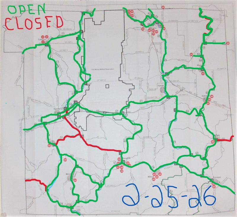 ALL TRAILS IN MONROE COUNTY ARE OPEN EXCEPT FOR THE FOLLOWING: THE ELROY-SPARTA BIKE TRAIL FROM SPARTA TO INTERSECTION 31 NORTH OF NORWALK. TRAIL 31 FROM THE ELROY-SPARTA TRAIL TO LEON. TRAIL 34 FROM THE MELVINA TURN OFF NEAR MIDDLE RIDGE TO THE LACROSSE COUNTY LINE. TRAIL 54 FROM CLIFTON TO JUNEAU COUNTY.