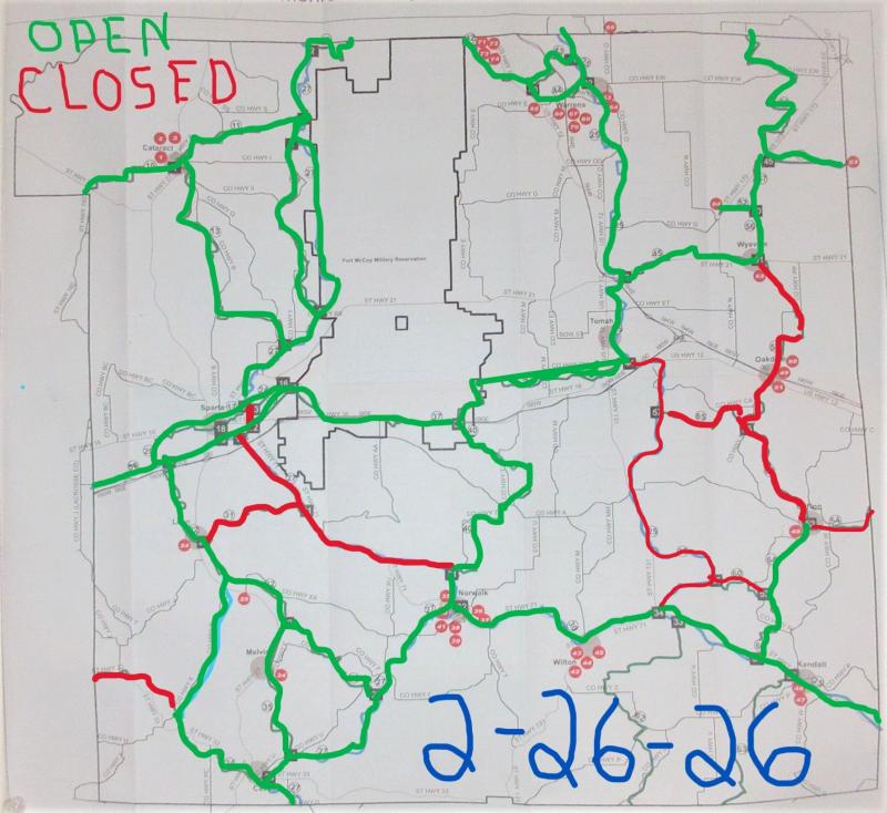 TRAIL 25 FROM TOMAH SOUTH TO THE ELROY-SPARTA BIKE TRAIL AND TRAILS 53, 65, & 66 COVERING WYEVILLE TO OAKDALE THEN TO CLIFTON AND OAKDALE TO TOMAH WILL CLOSE AT 6 AM THURSDAY MORNING THE 26TH, AND THE REST OF THE TRAILS IN THE COUNTY WILL CLOSE AT MIDNIGHT ON THURSDAY THE 26TH DUE TO THE WARM TEMPS FORECASTED.