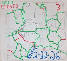 ALL TRAILS SHOULD BE CONSIDERED IN EARLY SEASON-RIDING CONDITION WITH SOME BARE SPOTS, SOME MUDDY SPOTS, LOW HANGING TREE LIMBS, DOWN TREES, AND POSSIBLE DOWN SIGNS DUE TO THE HIGH WINDS AND SOFT GROUND THAT WE HAD LEADING UP TO THIS STORM. PLEASE RIDE WITH CARE AND DO NOT RIP THE SNOW WE DO HAVE UP SO IT MELTS FASTER. WE ARE LOOKING FOR SNOWMOBILERS TO PACK IT DOWN.